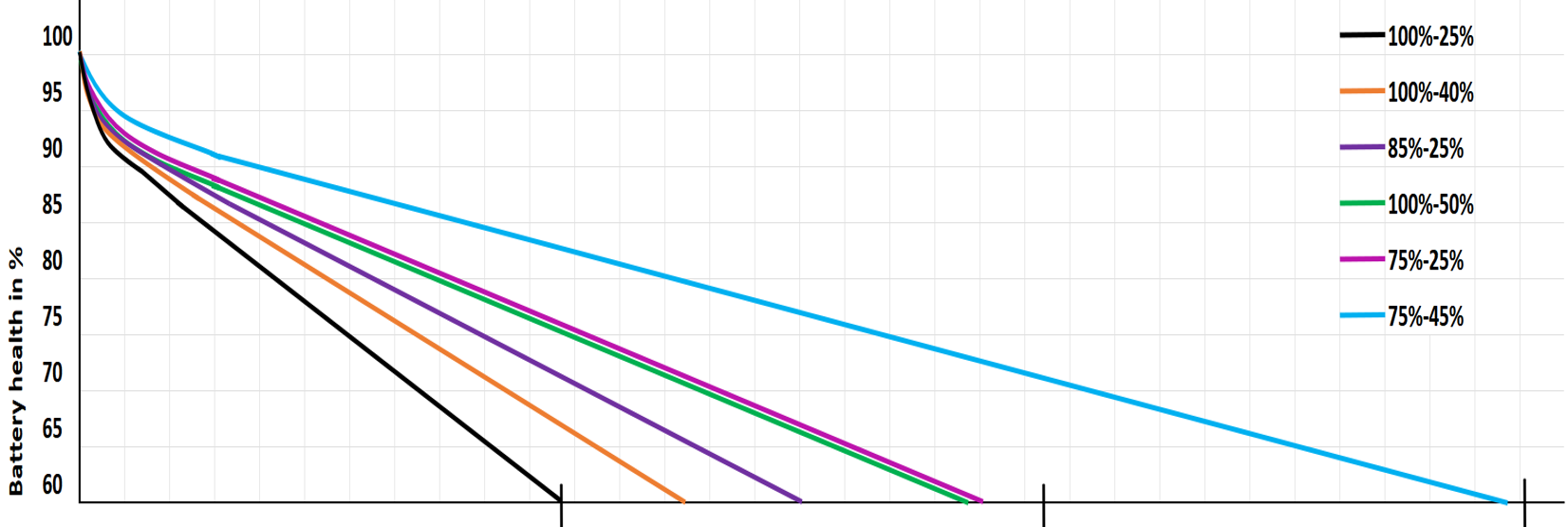 Hieronder is een grafiek te zien met data uit het onderzoek. Veel e-bike eigenaren laden de accu altijd tot 100% op en laden weer op als de accu rond de 25% is (zwarte lijn). Wanneer je de accu oplaadt tot 75% en niet verder ontlaadt dan 45% (blauwe lijn), is de levensduur circa drie keer langer.